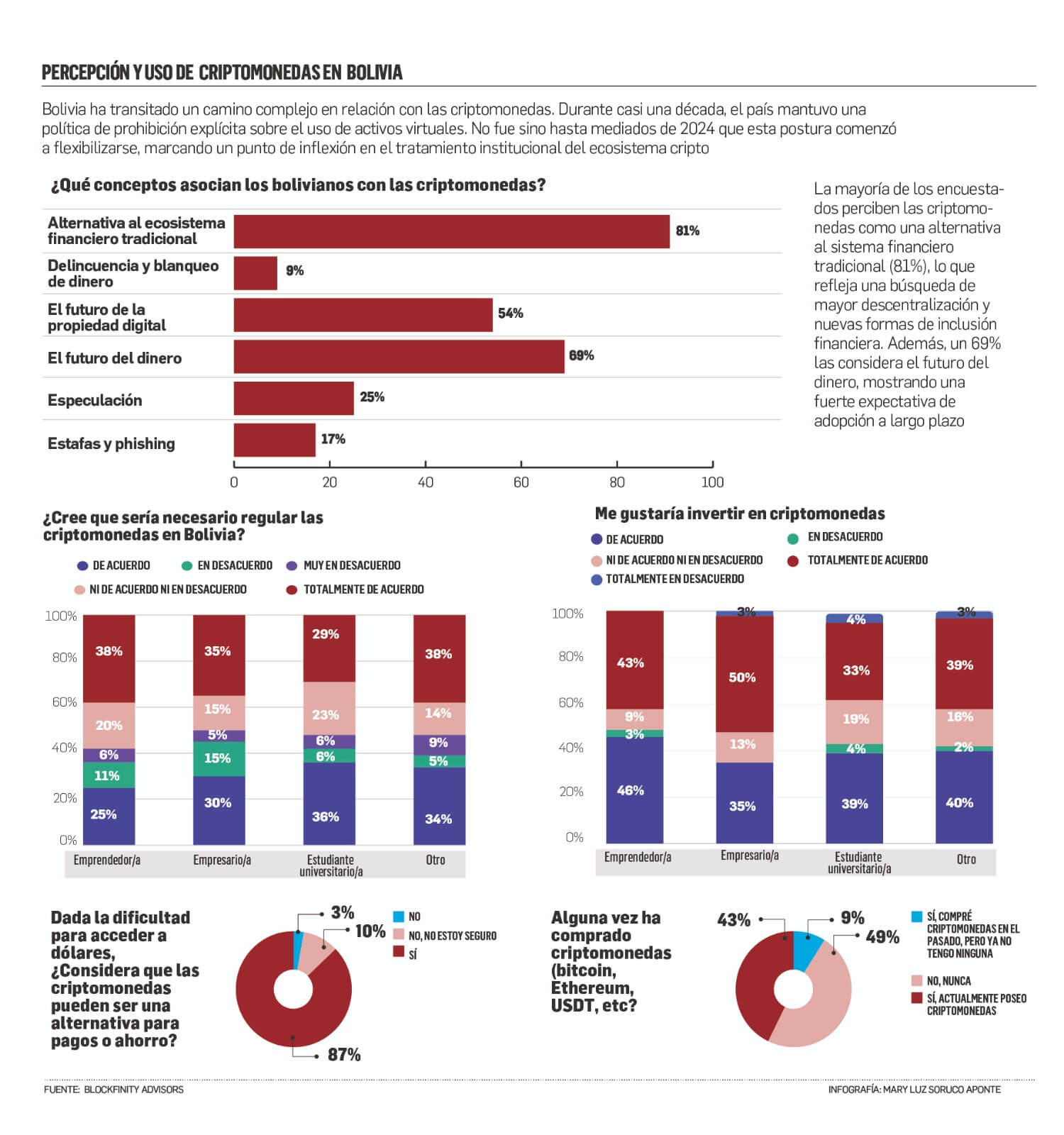 Al mismo tiempo, un 77% de los encuestados considera que las ‘criptos’ son un refugio financiero y un 18% se muestra indeciso. Y, ante la marcada dificultad para acceder a dólares en Bolivia, una mayoría significativa (87%) percibe las criptomonedas como una alternativa viable para pagos y ahorro, mientras que son los empresarios quienes lideran la posesión actual de criptomonedas, alcanzando un notable 53%.